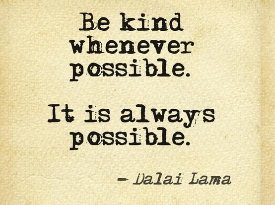 As I look back on my life I have not always been kind to everyone. Not everyone has been kind to me. But at a young age I was still taught to be kind to everyone. I am sure we all were. We were taught to share our toys and love one another. But as we grow older we start to develop habits and behaviors. Some good some bad. Even though we can't take the past back what if we started today? Be kind. Even if being kind is just simply smiling at someone as you pass by on the street or in the hallways at school. Smile.